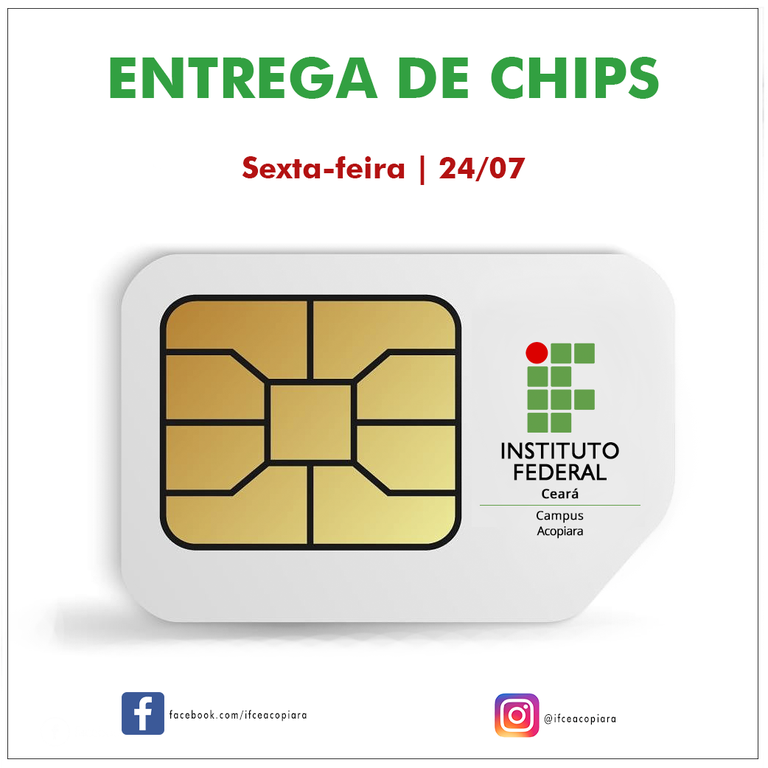 O IFCE campus Acopiara informa que o segundo dia de entrega dos chips com o pacote de dados de internet para o ensino remoto será 24/07/2020, no campus, das 08h às 11h30 e das 13h às 16h.