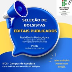 O curso de Licenciatura em Ciências Biológicas do IFCE Acopiara lança dois editais para seleção de estudantes do curso que queiram participar de programas de formação docente.