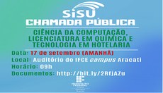 A chamada pública dos candidatos que manifestaram interesse por vagas remanescentes no Sisu 2019.2 será realizada nesta terça-feira (17), impreterivelmente, às 9h, no auditório do campus de Aracati. Os candidatos serão chamados pelo menos duas vezes, de forma oral, pela ordem de classificação, com base na lista disponível aqui. Não terão direito à vaga aqueles que não estiverem presentes na hora em que seu nome for citado. O campus de Aracati está ofertando vagas para os cursos de Ciência da Computação, Hotelaria e Química.