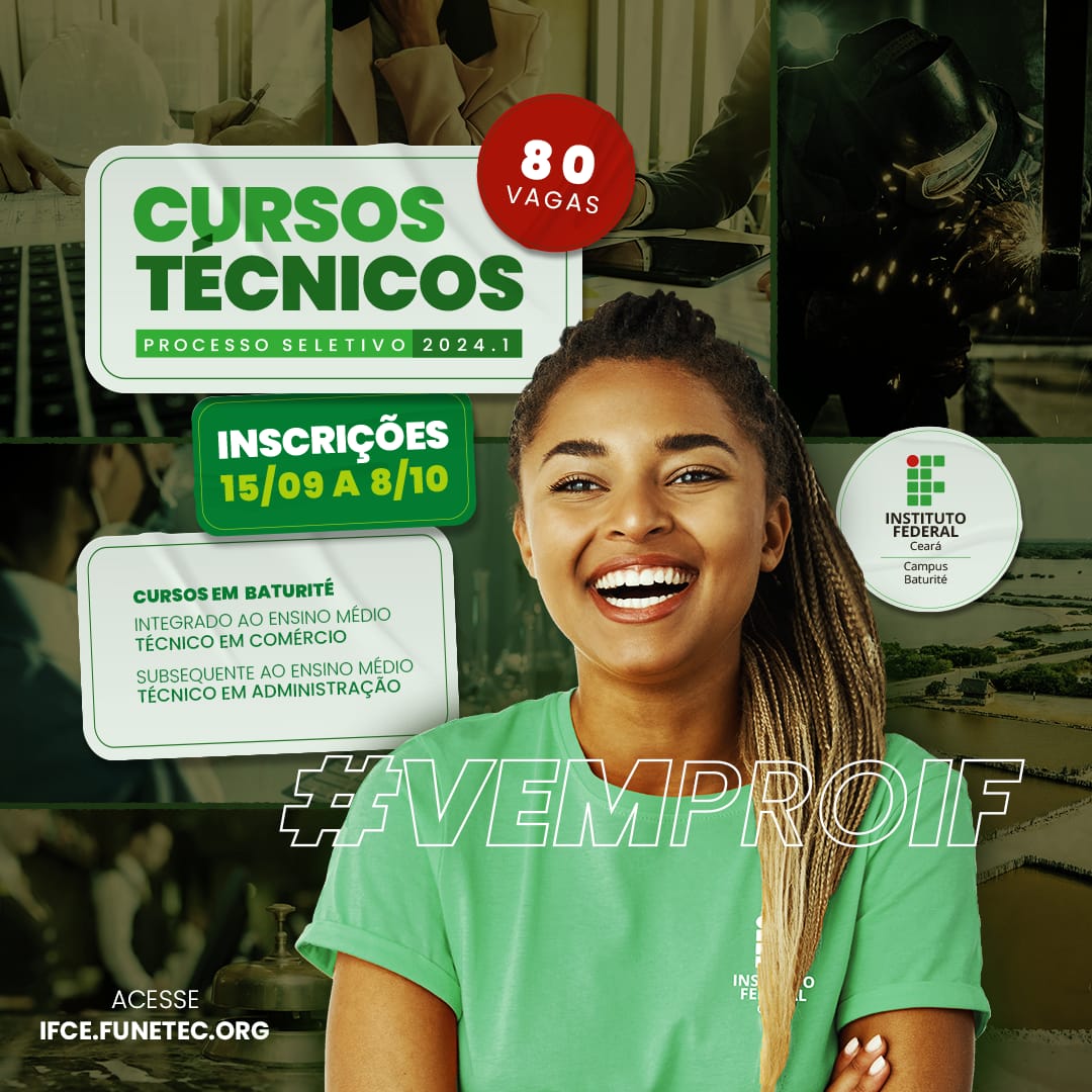 De 15/09 a 08/10 estão abertas as inscrições para o processo seletivo de cursos técnicos gratuitos. Para o campus de Baturité, são 40 vagas para o curso integrado em Comércio (para quem está concluindo o Ensino Fundamental) e 40 vagas para o curso subsequente em Administração (para quem já terminou ou está terminando o Ensino Médio).