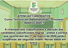 Seguindo as recomendações do Comitê de Combate ao Covid-19 no Instituto Federal do Ceará (IFCE), o campus Baturité anuncia que as atividades que estavam agendadas para o dia 17 de março de 2020 (chamada dos classificáveis e aferição de heteroidentificação dos candidatos classificáveis negros - pretos e pardos), para o Curso Técnico em Administração, estão suspensas até segunda ordem.