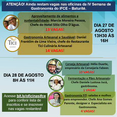 A comissão organizadora da IV Semana de Gastronomia do Campus Baturité, divulga, no dia 21 de agosto, a relação das inscrições deferidas para as participarem das oficinas que acontecerão durante o evento.