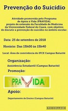 As equipes da Coordenação de Assistência Estudantil e do Departamento de Ensino Campus Baturité promovem, nesta terça-feira (25), mesa-redonda para conversa entre servidores, alunos e comunidade local sobre prevenção do suicídio. A ação faz parte de discussões em função da campanha Setembro Amarelo. A atividade é promovida pelo Programa de Apoio à Vida (Pravida), projeto de extensão da Faculdade de Medicina da Universidade Federal do Ceará, que tem o objetivo de falar sobre a prevenção do suicídio no âmbito escolar.