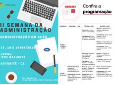 Ao longo dos dias 17, 18 e 19 de setembro, o campus Baturité promove a segunda edição da Semana da Administração, com o tema: Administração em Ação. A programação, que acontece no auditório da unidade, contará com oficinas, palestras e mesas-redondas.