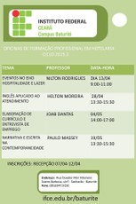 O campus de Baturité está realizando, nos meses de abril e maio, o segundo ciclo de Oficinas de Formação Profissional em Hotelaria. As oficinas têm vários eixos de formação: Eventos no eixo Hospitalidade e Lazer, que será ministrada com o professor Nilton Rodrigues, o eixo Inglês aplicado ao atendimento, com o professor Helton Moreira. Elaboração de currículo e entrevista de emprego, Joab Dantas e a oficina de Narrativa escrita na contemporaneidade, com o docente do campus, Paulo Massey. As oficinas são direcionadas a todos os públicos.