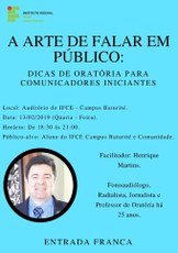 No dia 13 de fevereiro, o campus Baturité do Instituto Federal do Ceará (IFCE) promoverá a palestra: " A arte de falar em público: Dicas de Oratória para Comunicadores iniciantes. O evento acontece de 18h30 às 21h no auditório da unidade.