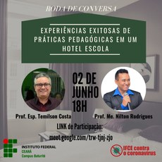O docente do campus Baturité, Temílson Costa, em parceria com o professor Nilton Rodrigues do Hotel Escola IFCE – Guaramiranga, promoverá, no dia 02 de junho de 2020, uma roda de conversa na qual será debatida, entre outros temas, as experiências exitosas de práticas pedagógicas em um hotel escola.