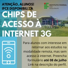 O Campus Baturité disponibilizou, no dia 02 de julho de 2020, de formulário online (disponível no link da descrição do perfil) no sentido de registrar a manifestação de interesse na aquisição dos CHIP's que poderão auxiliar no retorno às atividades remotas, uma vez que tais CHIP's possuem dados móveis (3G).
