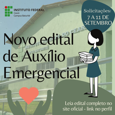 O Campus Baturité lançou, nesta terça-feira, 02 de setembro, o edital para auxílio estudantil emergencial. As inscrições acontecem no período de 07 a 11/09/2020, por meio, exclusivamente, do SISAE (www.sisae.ifce.edu.br), preenchendo todas as etapas indicadas no sistema e anexando as documentações solicitadas. O resultado da seleção está previsto para ser divulgado no dia 22 de setembro de 2020.