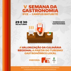 O Campus Baturité promove, durante os dias 29 e 30 de outubro, a quinta edição da Semana da Gastronomia. Neste ano, a V Semana da Gastronomia ocorrerá em ambiente virtual. O evento traz como tema a “Valorização da culinária regional, a partir do turismo gastronômico local.”