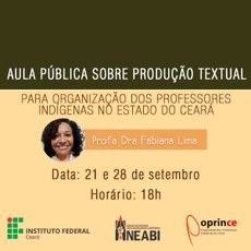 Nos dias 21 e 28 de setembro de 2021, o NEABI ( Núcleo de Estudos Afrobrasileiros e Indígenas) promove aulas públicas sobre produção textual. A ação é destinada para Organização dos professores indígenas do Estado do Ceará. A aula será transmitida pelo canal do Youtube do campus Baturité, a partir das 18h. A aula será ministrada pela professora Dra. Fabiana Lima.