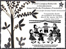 No dia 02 de março de 2021, o Campus Baturité promove apresentação teatral intitulada “Uma noite de Dramas e Encontros.” A performance será realizada pelo grupo Drama Teatro Brincante e será transmitido, por meio do Canal Oficial do Campus Baturité no Youtube, diretamente do auditório da unidade a partir das 19:00h.