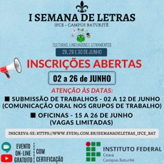 Durante os dias 28, 29 e 30 de junho de 2021, o Instituto Federal Campus Baturité promove a primeira edição da Semana de Letras, cujo o tema é Cultura, Linguagens e Letramentos. O evento acontece de forma online, em virtude do Ensino Remoto adotado pelo IFCE.