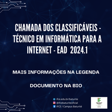 O IFCE Campus Baturité divulga a Chamada dos Classificáveis, Curso Técnico em Informática para Internet- EaD. A Chamada se refere ao Processo Seletivo 2024.1 - Cursos Técnicos Subsequentes na Modalidade à Distância e regido pelo EDITAL Nº 13/2023 DI/PROEN/REITORIA-IFCE. A Coordenação de Controle Acadêmico do campus ressalta que poderão concorrer apenas os candidatos habilitados na lista publicada e que caso o(a) candidato não possa comparecer no dia da chamada, poderá vir seu representante legal, com procuração devidamente autenticada.