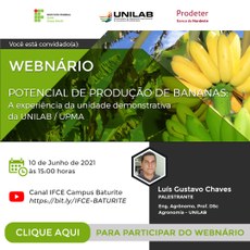 No dia 10 de junho de 2021, o Campus Baturité realiza mais um encontro entre o PRODETER - Banco do Nordeste e a comunidade da região do Maciço de Baturité. Neste encontro, Luis Gustavo Chaves, engenheiro Agrônomo e docente da UNILAB, conversará sobre o potencial de produção de bananas na região. Ele vai compartilhar a experiência da unidade demonstrativa da UNILAB.