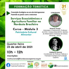 O docente do Campus Baturité, Roberto Araújo, participa, no dia 28 de abril de 2021, do evento intitulado “ A formação temática sobre os Serviços Ecossistêmicos e Agricultura Familiar no Nordeste Brasileiro". A atividade será realizada por meio Plataforma Zoom e com transmissão pelo Facebook da Fundação Cepema, no horário de 10h às 12h.