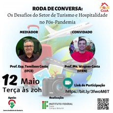 Os “Desafios do Setor do Turismo e Hospitalidade Pós-pandemia” será tema de uma roda de conversa on-line. Na ocasião, o docente do IFCE campus Baturité, Temílson Costa, será o mediador da conversa que terá como convidado o professor Wagner Costa do Instituto Federal do Rio Grande do Norte.