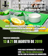 A IV Semana de Gastronomia do IFCE - Baturité recebe inscrições para trabalhos científicos desenvolvidos com as temáticas "Gastronomia, alimentação saudável". Os trabalhos devem ser submetidos, no período de 13 a 21 deste mês, através do link: www.bit.ly/editalsemana. As apresentações serão na modalidade oral e ocorrerão no dia 29 de agosto, no auditório do campus IFCE - Baturité.