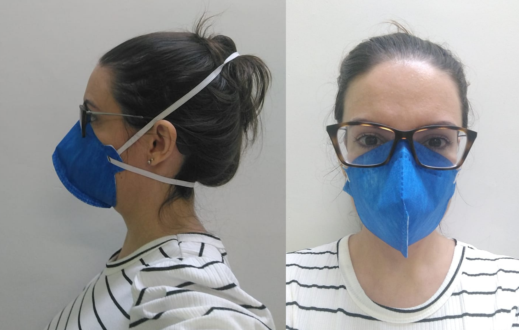 Professora Patrícia Lana demonstra o uso correto da máscara PFF2