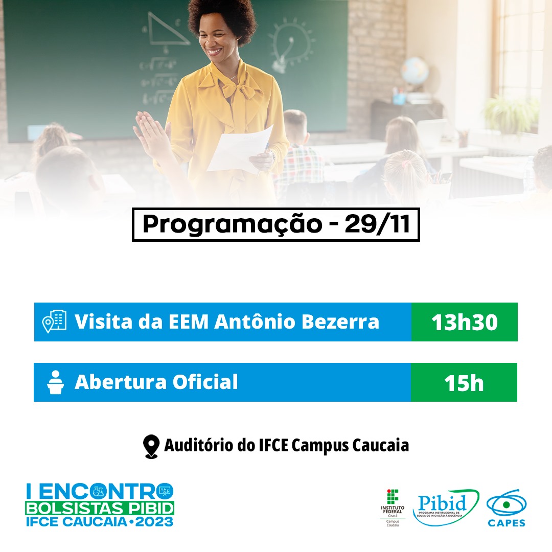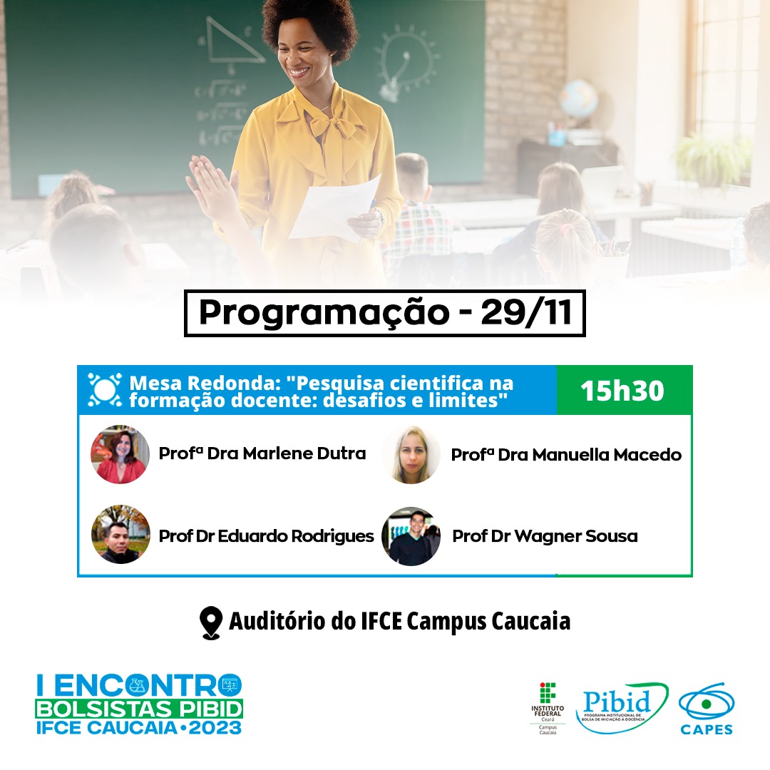 O encontro é direcionado para os discentes de ambas as licenciaturas e, principalmente, para os bolsistas do PIBID do campus de Caucaia. Todos os estudantes presentes receberão certificado de participação.