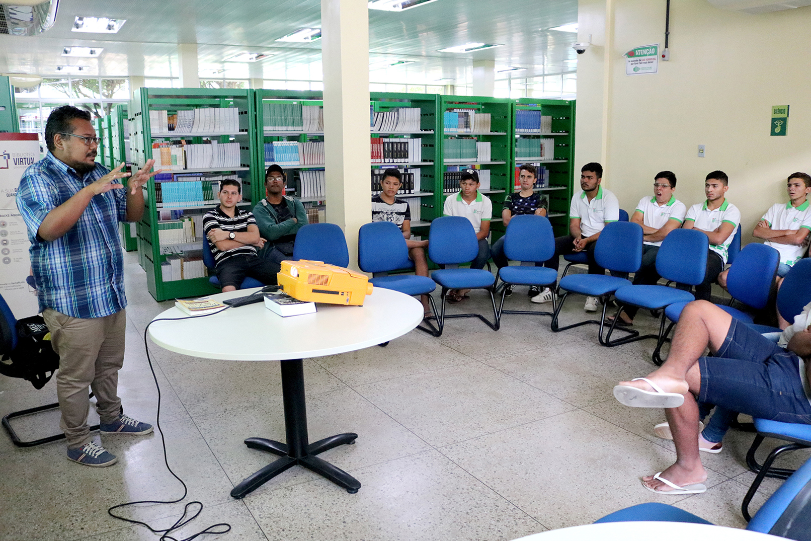 O bibliotecário Leandro Lopes ministra oficina de iniciação ao serviços da biblioteca (Foto: Vitor Meireles)
