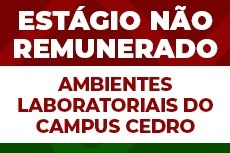 A direção-geral do campus do Cedro publicou nesta quarta-feira, 25/1, o edital para seleção de estágio não remunerado para ambientes laboratoriais do campus do Cedro. O período de inscrição de é de 27/1 a 12/2. Ofertam-se 14 vagas, distribuídas nos cursos de Mecatrônica, Técnico em Mecânica, Técnico em Eletrotécnica.