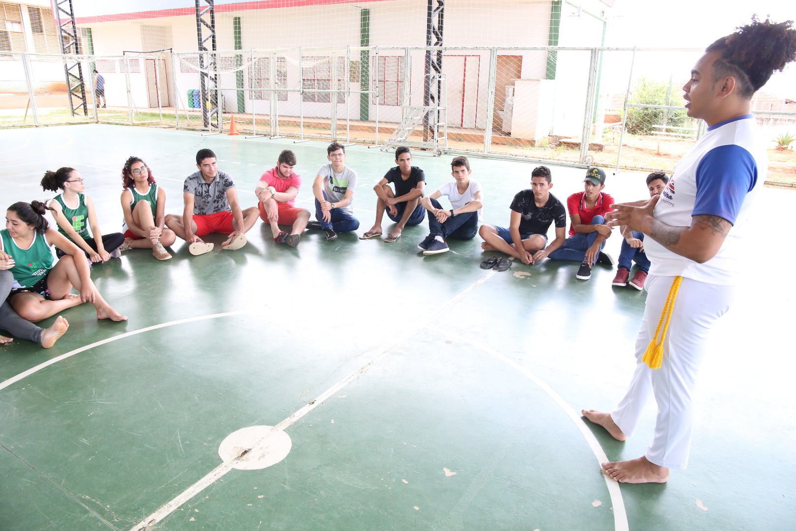 Instrutor Kenedi Anderson explica sobre capoeira para a turma do S6 do Integrado em Mecânica (Crédito: Anderson Lima)