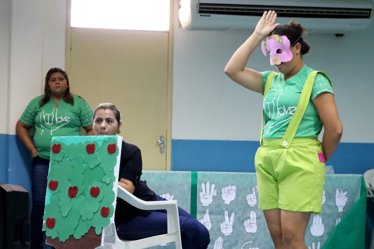 Alunas do curso de extensão de Libras encenam "Os três porquinhos" (Crédito: Vitor Meireles)