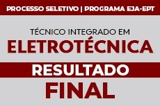 Divulgado os resultados preliminar e final do edital complementar para a seleção do curso Técnico em Eletrotécnica (Integrado), na modalidade Educação de Jovens e Adultos (EJA). Ofertaram-se 25 vagas e inscreveram-se 21 candidatos.