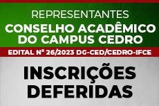 Foi publicado o resultado das inscrições deferidas da eleição para o Conselho Acadêmico do campus do Cedro.Nesta segunda-feira,12/6, é a data para impugnação das candiaturas pelo email gabinete.cedro@ifce.edu.br. A votação vai ser realizada no dia 22/06, obedecido ao horário de votação compreendido entre 8h e 20h, por meio de formulário eletrônico constando os nomes dos candidatos a ser divulgado com o resultado final das Inscrições homologadas/deferidas.
