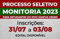 A direção geral publicou nesta quinta-feira, 27/7, o edital de monitoria. Ofertam-se 5 vagas remuneradas e 6 voluntárias. O prazo de inscrição vai de 31/7 a 3/8 e deve ser feita na recepção do campus. A bolsa é de R$ 700,00 e é paga durante 4 meses. Vai ser realizada uma prova com conhecimentos específicos elaborada pelo docente orientador do componente curricular. Classifica-se quem obtiver resultado igual ou superior a 7. A classificação é por ordem decrescente. A íntegra do edital e dos 10 anexos estão no menu editais do site.
