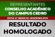 A Comissão Eleitoral informa que foi homologado o resultado da votação da eleição para o Conselho Acadêmico do campus do Cedro. Não houve recurso contra o resultado. A votação aconteceu no último dia 22/06. Foram eleitos 2 representantes titulares e 2 representantes suplentes dos Docentes, eleitos por seus pares. 1 representante titular e 1 suplente dos técnicos administrativos, eleitos por seus pares.2 representantes titulares e 2 suplentes dos discentes, eleitos por seus pares.