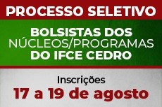 O IFCE Cedro publicou edital para selecionar bolsistas que irão atuar nos núcleos/programas de extensão (NEABI, NAPNE, EGRESSOS, INCUBADORA, ESTÁGIO) em articulação com a Coordenação de Extensão. O prazo de inscrição vai de 17 a 19/8.