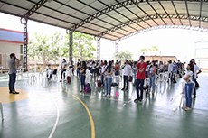 D diretor-geral do campus do Cedro, Gleydson Lima (em pé e à esquerda) conversa com os alunos na quadra na retomada das aulas presenciais.(Crédito:Vitor Meireles)