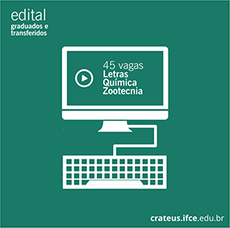 O IFCE campus de Crateús inicia nesta segunda-feira (30/11) as inscrições da seleção para preenchimento de vagas ao ingresso por Transferência Interna, Transferência Externa e como Diplomado, para o período letivo 2015.2. No total, serão ofertadas 45 vagas para os cursos de bacharelado em Zootecnia (matutino), Licenciatura em Letras (matutino) e técnico integrado em Química (vespertino), sendo 15 vagas para cada curso.