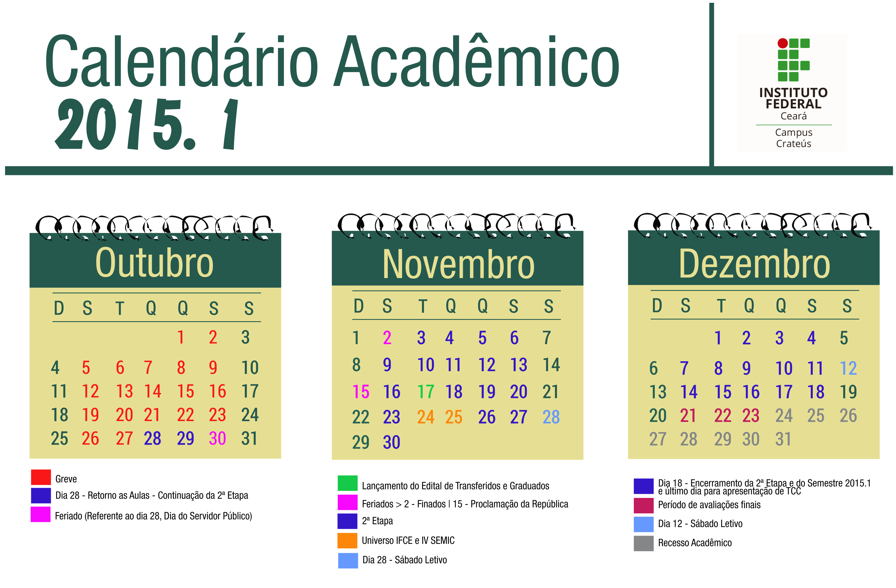 As novas datas da continuação do calendário acadêmico do semestre 2015.1 do IFCE campus de Crateús já foram definidas, só acessar a imagem (segue link). Reniciado no dia 28 de outubro o encerramento do período letivo será no dia 18 de dezembro e as avaliações finais ocorrerão nos dias 21, 22 e 23 do mesmo mês. Os estudantes devem também ficar atentos os dois sábados letivos previstos para os dias 28 de novembro e 12 de dezembro.