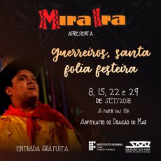 O Miraira apresenta aos sábados de setembro, às 18h, no anfiteatro do Centro Cultural Dragão do Mar de Arte e Cultura, o espetáculo "Guerreiros, santa folia festeira". A participação é fruto de aprovação em edital do Governo Estadual para compor a programação da quarta edição da Temporada de Arte Cearense 2018.