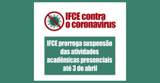 O Comitê de Enfrentamento ao Covid-19 no Instituto Federal do Ceará (CEC/IFCE) decidiu pela prorrogação da suspensão das atividades acadêmicas presenciais até o dia 3 de abril em todos os 33 campi da instituição e no Polo de Inovação Embrapii Fortaleza. A decisão visa atender as recomendações das autoridades de saúde nacionais e estaduais de isolamento social para tentar frear o avanço do novo coronavírus no Brasil. Durante o período, as atividades de ensino online continuam normalmente por meio do Sistema Acadêmico, no qual os professores disponibilizam atividades de suas respectivas disciplinas aos alunos.