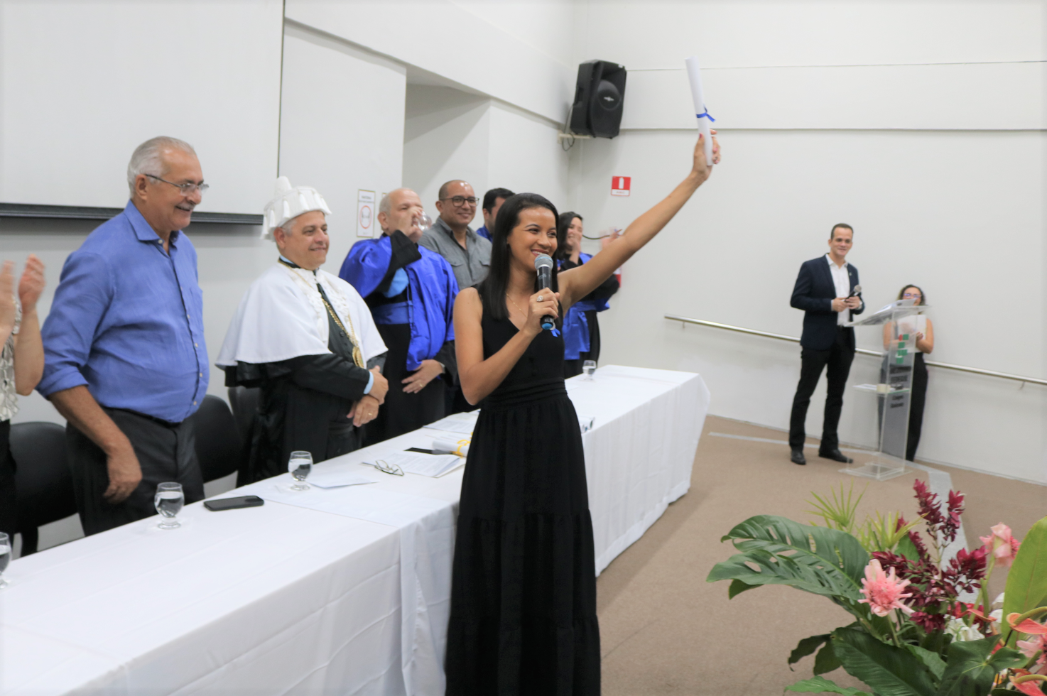 Concluinte Sinara Rodrigues ergue seu certificado simbólico de conclusão do Curso Técnico em Logística.