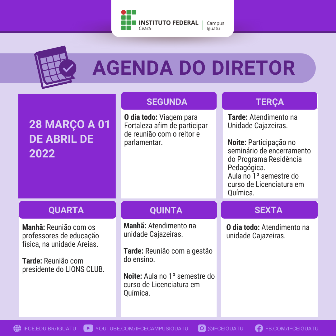 Agenda do diretor - 28 de março a 01 de abril de 2022