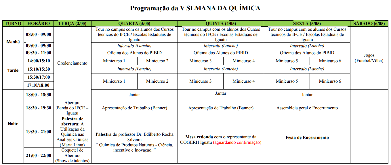 Além de mostras de pesquisas na área, estão previstas na programação: oficinas, minicursos, palestras com professores renomados, mesas-redondas e apresentações culturais. A submissão de trabalhos é realizada pelo e-mail semanadaquimicaiguatu@gmail.com até dia 29 de abril. As inscrições são realizadas pelo site http://sdaquimicaigt.wixsite.com/sdqifce
