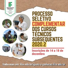 Quem não conseguiu realizar a inscrição no processo seletivo de cursos técnicos subsequentes 2020.2 terá uma nova oportunidade. No período de 14 a 18 de dezembro, pessoas que já concluíram o Ensino Médio poderão se inscrever no processo seletivo complementar do IFCE-campus Iguatu. Serão ofertadas vagas nos cursos Agroindústria, Agropecuária e Comércio. A seleção ocorre por meio do histórico escolar do candidato, ou seja, não há prova.