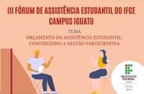 Nos dias 15 e 16 de setembro de 2021, será realizada a terceira edição do Fórum de Assistência Estudantil do IFCE - campus Iguatu. O evento traz este ano a temática "ORÇAMENTO DA ASSISTÊNCIA ESTUDANTIL: CONSTRUINDO A GESTÃO PARTICIPATIVA".