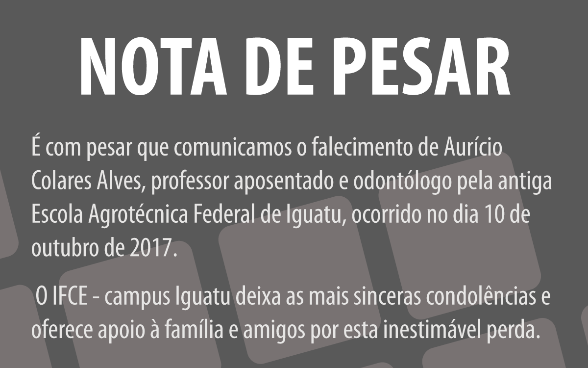 É com pesar que campus Iguatu comunica o falecimento de Aurício Colares Alves. Aurício , odontólogo e professor aposentado desde 1995 pela antiga Escola Agrotécnica Federal de Iguatu. O velório está sendo realizado em Fortaleza, local onde residia.