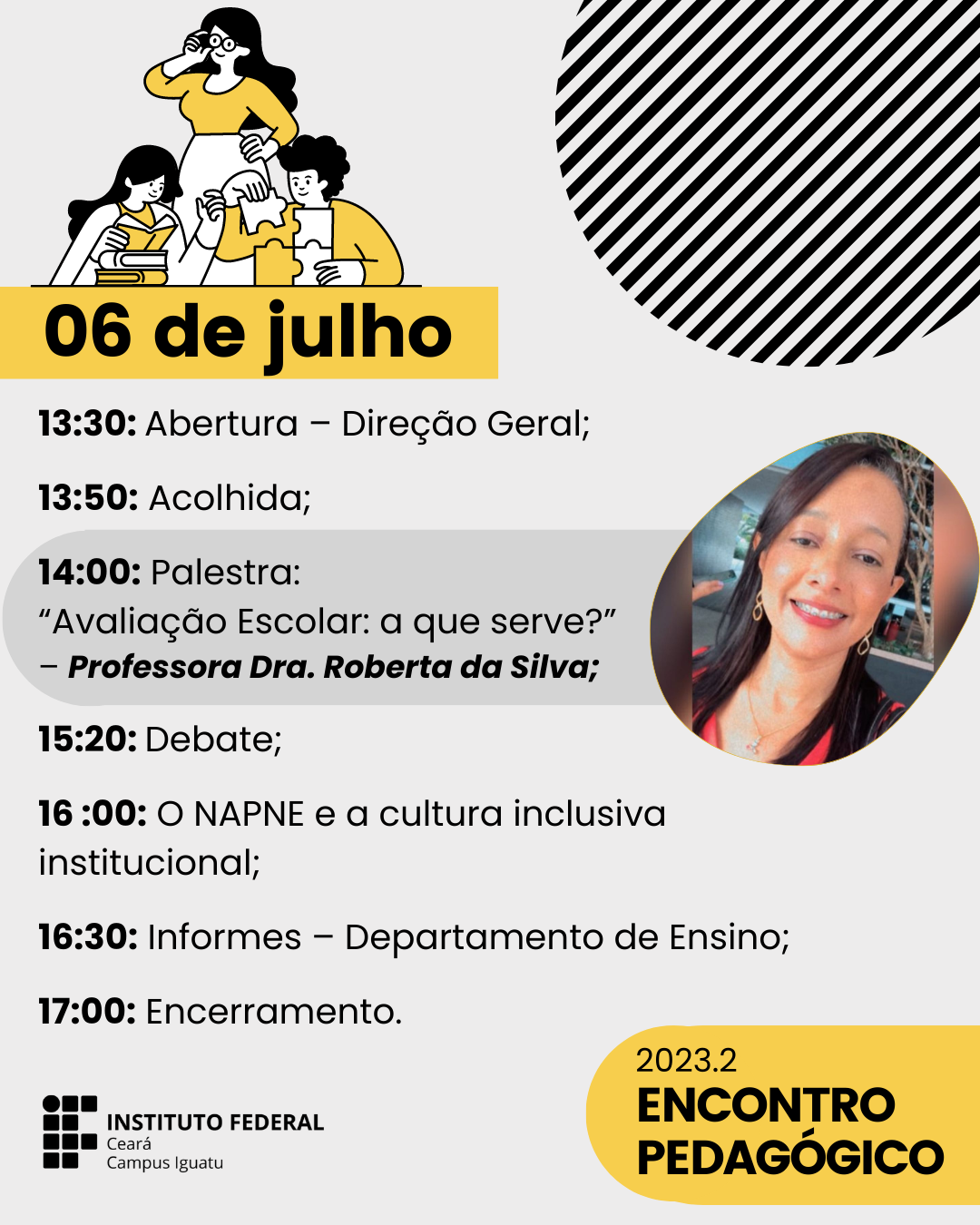 Nos dias 6 e 7 de julho, o IFCE-campus Iguatu promoverá o Encontro Pedagógico 2023.2, em conformidade com o Art. 170 do Regulamento de Organização Didática da instituição. O evento, voltado para os servidores do campus, contará com a palestra da Professora Dra. Roberta da Silva, intitulada "Avaliação Escolar: a que serve?".