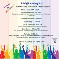 Encerrando a Semana, o Napne traz o III Sarau do IFCE: a vida é tão rara, no dia 14, às 19h, no IFCE campus Itapipoca. As inscrições já se encontram abertas aos estudantes e à comunidade externa para apresentações artísticas e mostras de artes plásticas e visuais. Elas podem ser feitas por formulário on-line.