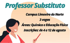 O campus de Limoeiro do Norte do Instituto Federal do Ceará (IFCE) abre inscrições do processo seletivo para contratação de professores substitutos. por tempo determinado. São ofertadas três vagas para as seguintes áreas: Educação Física (subáreas Ginástica e atividades rítmicas-expressivas; Treinamento físico-esportivo) e Química (subárea Química geral). Para mais detalhes sobre especialidades e habilitações, confira as vagas no Anexo I do edital.