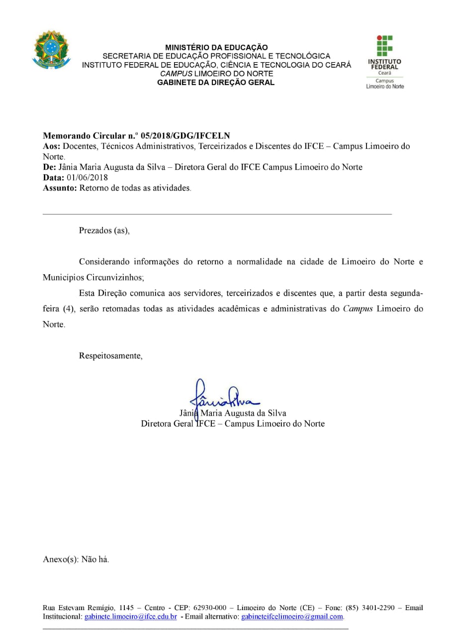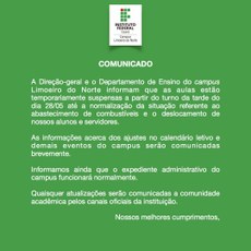 A Direção-geral comunica aos servidores, terceirizados e discentes que, a partir de segunda-feira (4), serão retomadas todas as atividades acadêmicas e administrativas no campus de Limoeiro do Norte, conforme Memorando expedido sexta-feira (1/4).