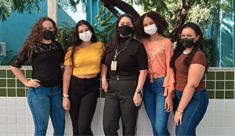 As estudantes e a nova orientadora do projeto, professora Caroline de Goes Sampaio. O grupo vai desenvolver um aplicativo para monitorar a qualidade do ar e ajudar pessoas com problemas respiratórios (Foto: Comunicação Social)