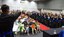 Descrição da imagem: Um formando de costas, trajando beca preta, com braço direito erguido profere juramento. Ao fundo o auditório lotado. As turmas de formandos, todos trajando beca, no lado esquerdo da imagem, em pé, com o braço direito erguido, proferem o juramento.